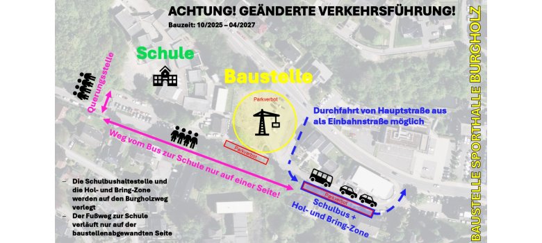 Während der Bauzeit kommt es zu Änderungen im Verkehrsverlauf und der Wegeführung, insbesondere im Bereich des Schulwegs. Um Ihnen die Orientierung zu erleichtern, stellt das Bauamt eine anschauliche Skizze bereit, die die neuen Verkehrs- und Schulwegführungen erläutern.