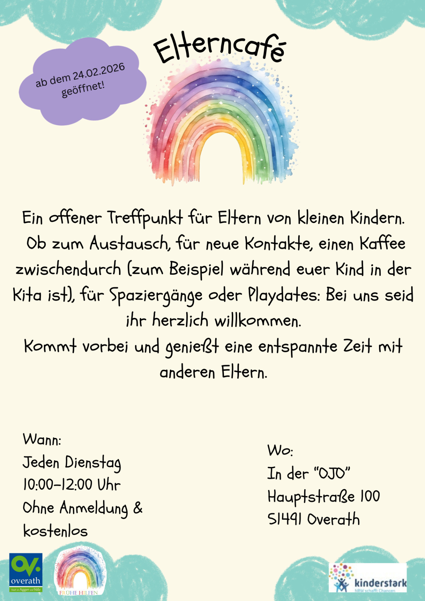 Das Elterncafé bietet einen offenen und ungezwungenen Treffpunkt für Eltern mit kleinen Kindern. Ob zum Austausch mit anderen Eltern, für neue Kontakte, einen Kaffee zwischendurch – zum Beispiel während das eigene Kind in der Kita ist – oder für gemeinsame Spaziergänge und Playdates: