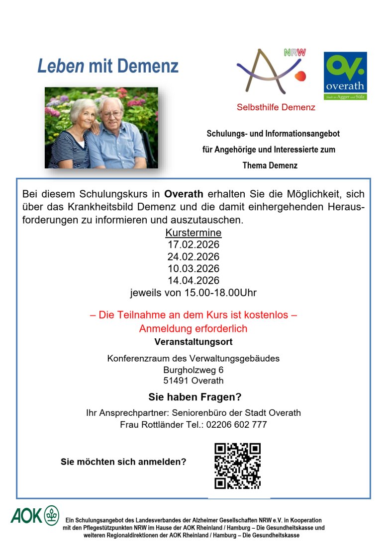 Bei diesem Schulungskurs in Overath erhalten Sie die Möglichkeit, sich über das Krankheitsbild Demenz und die damit einhergehenden Herausforderungen zu informieren und auszutauschen.